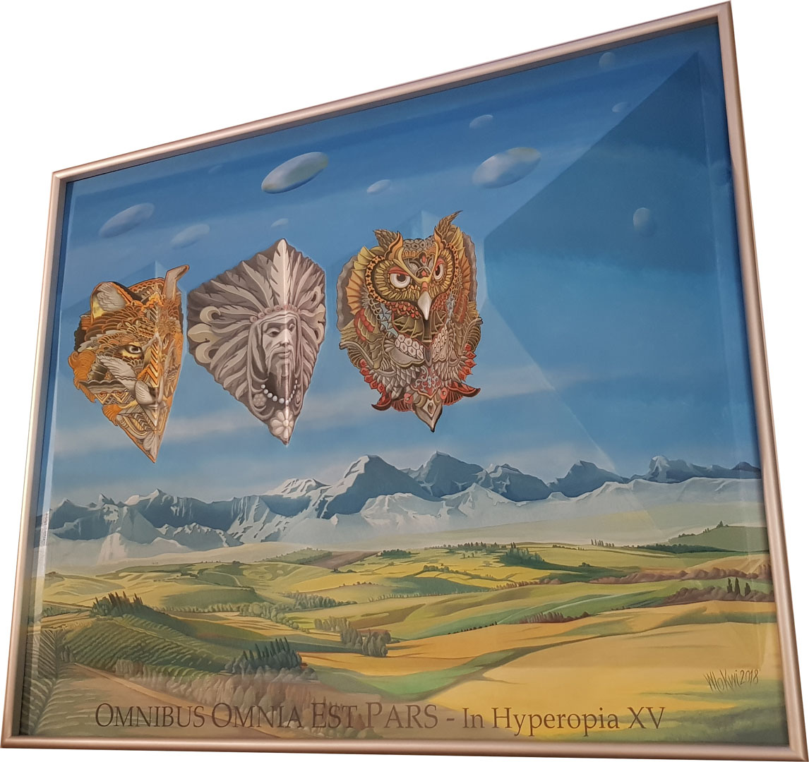 Obraz – tlen. Przestrzeń nieziemska choć składająca się z gór, łąk, pól. Symbole kojarzące się z kulturą Indian jakby lewitują nad całością. Symbol Indianina po lewicy i prawicy z wilkiem i sową – to odwołanie do pierwotnych kultur opartych na Bogu – naturze. Perspektywa nieba raczej nie ziemska.